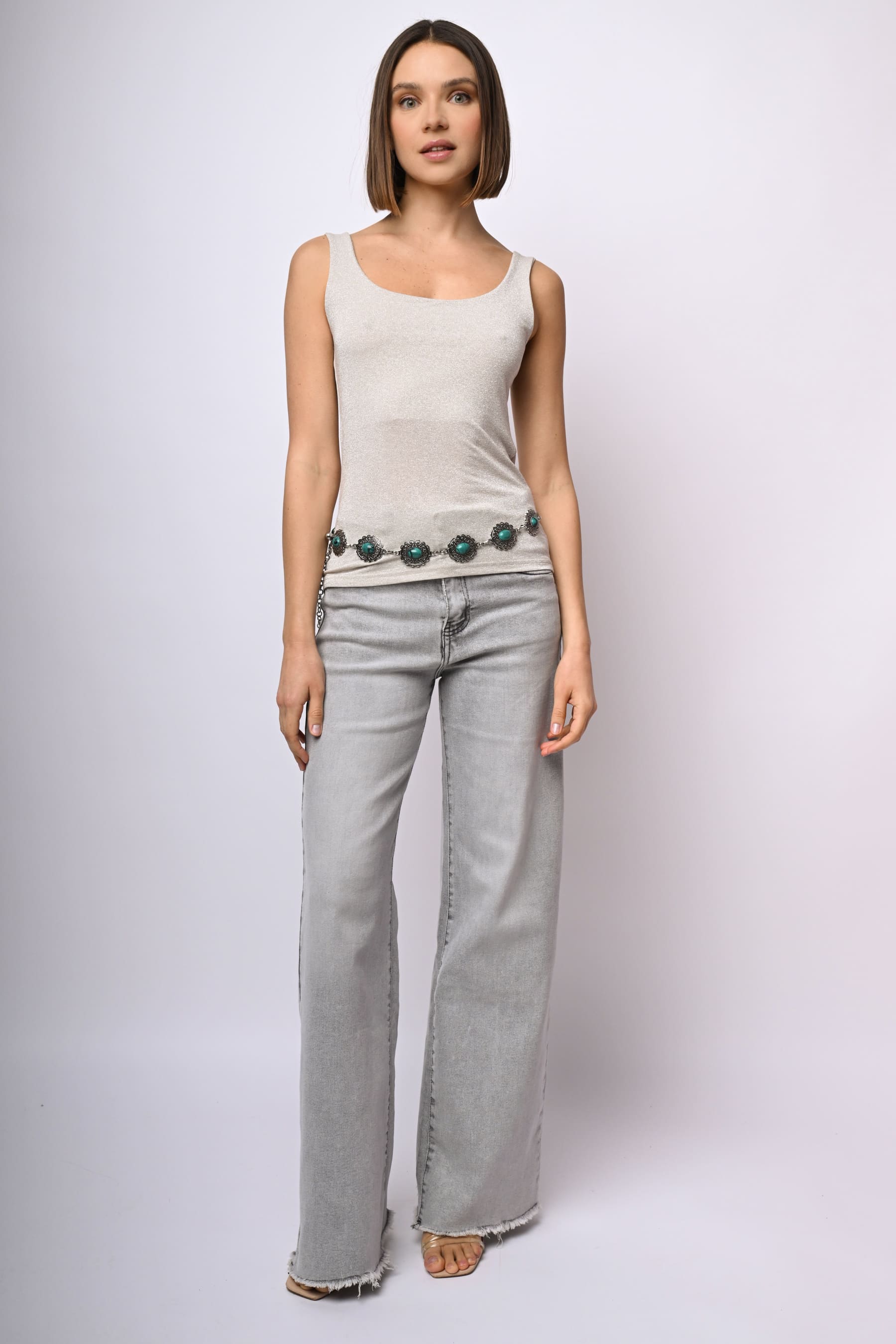 Canotta in maglia lurex misto viscosa bianca con ampio scollo tondo e silhouette aderente.