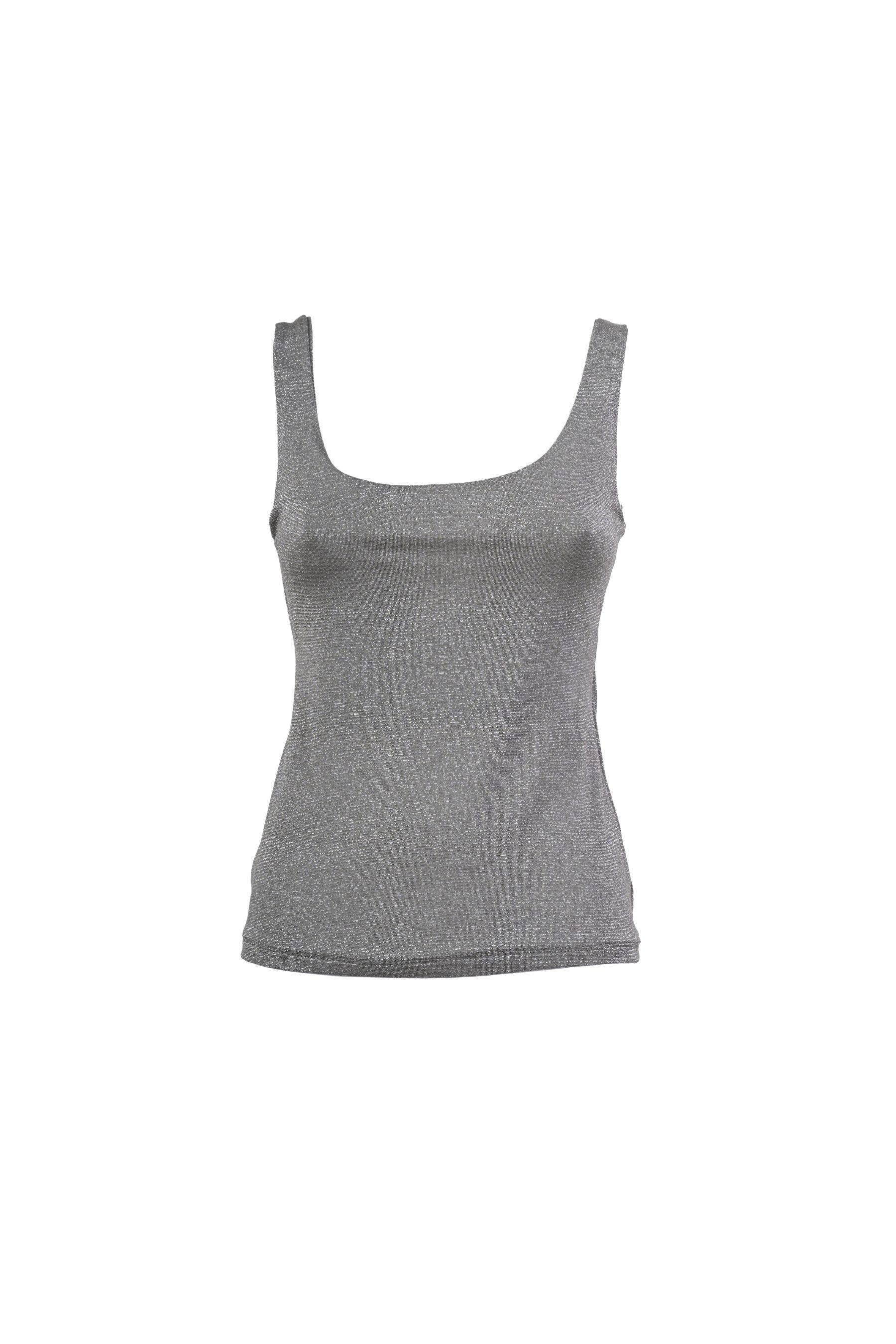 Canotta in maglia lurex misto viscosa verde militare con ampio scollo tondo e silhouette aderente.