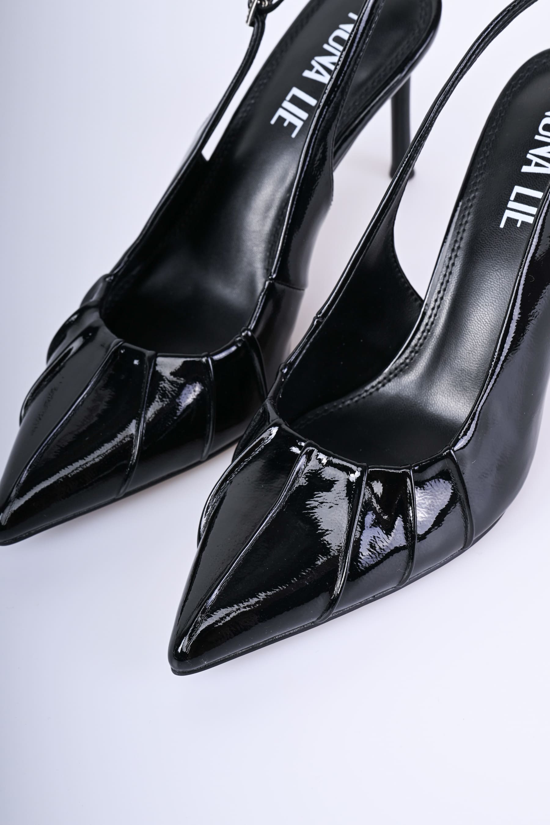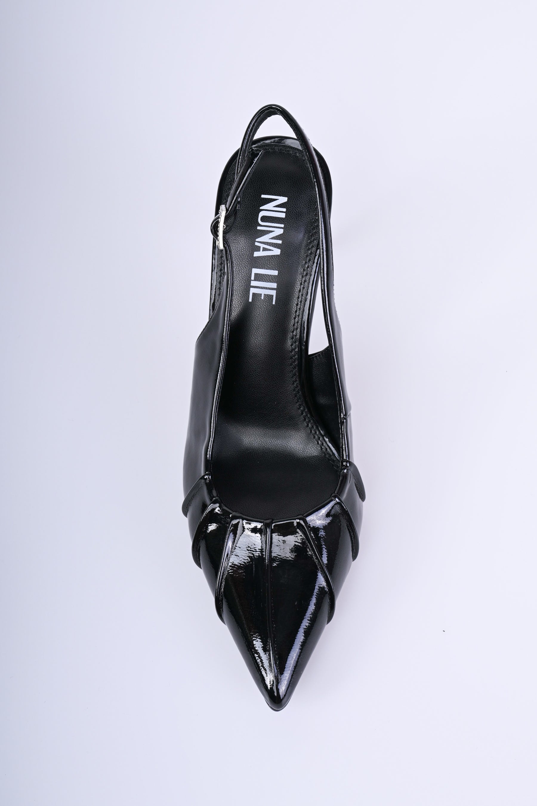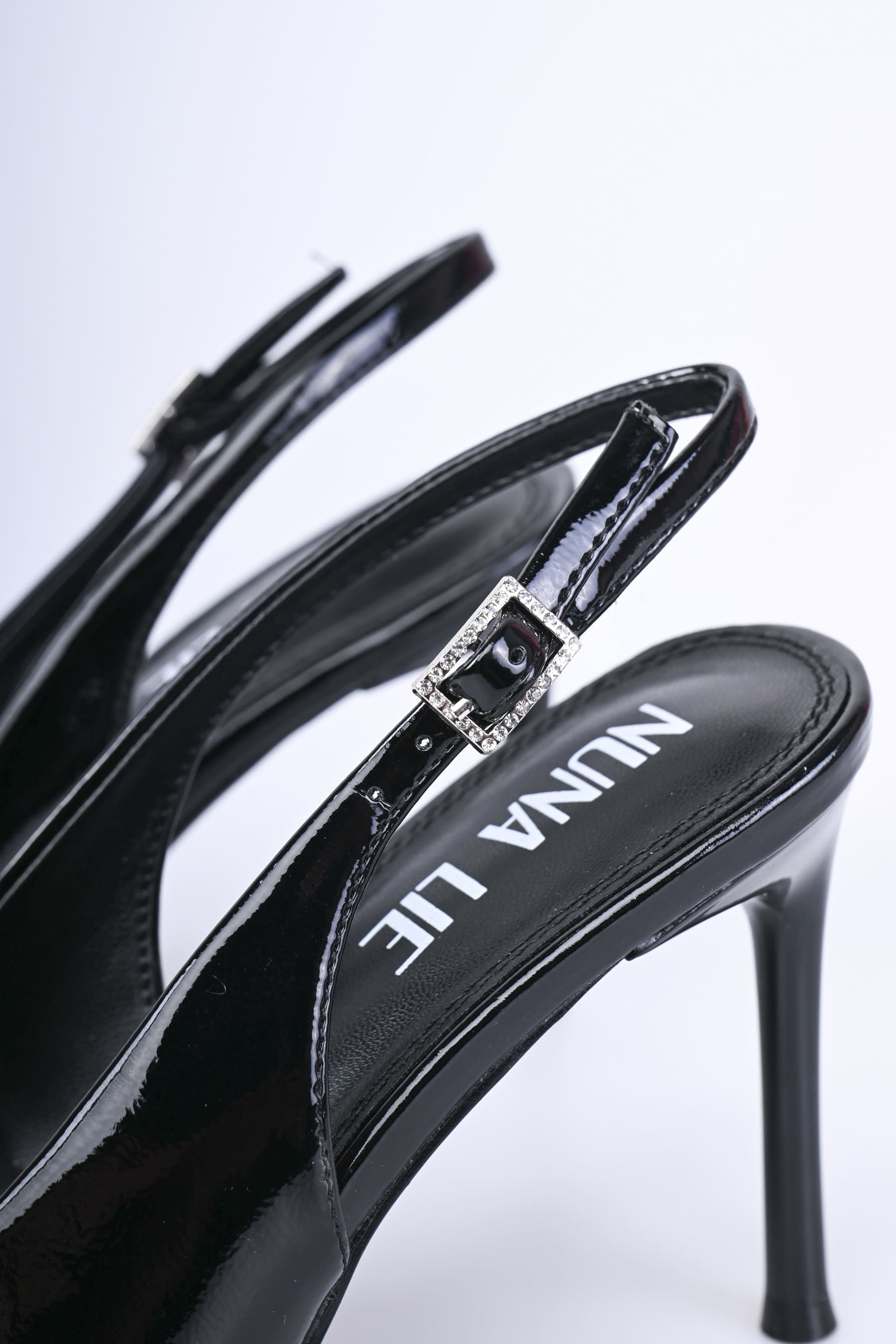 Décolleté slingback in simil-vernice nera con punta affusolata sottolineata da nervature, cinturini sottili con fibbie regolabili impreziosite da strass e tacco alto a stiletto.