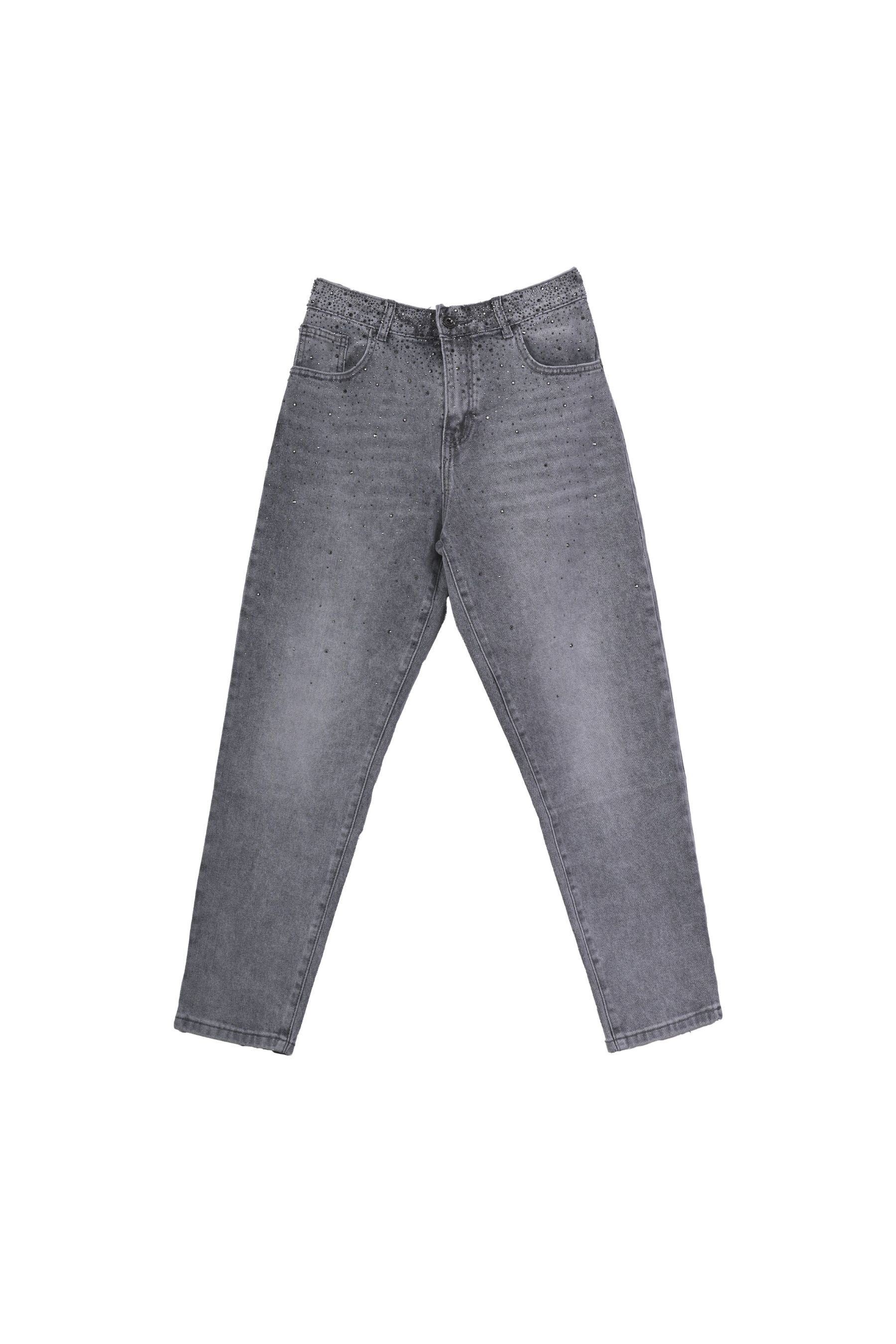 Jeans baggy in denim stretch misto cotone grigio chiaro con strass decorativi sul davanti e sul retro, passanti per cintura, chiusura con bottone e zip e taglio cinque tasche.